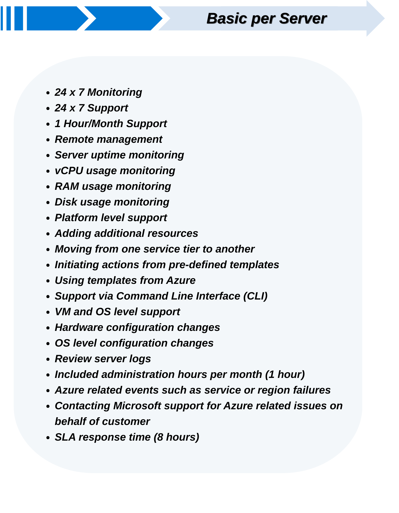 Zabýváme se vzdálenou správou infrastruktury Azure našich zákazníků a staráme se o úkoly, jako je zřizování serverů, konfigurace a údržba. To umožňuje našim zákazníkům soustředit se na své hlavní obchodní aktivity.